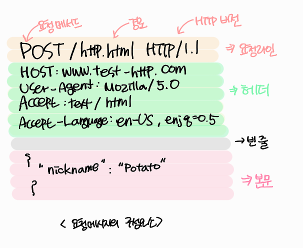 차례대로 요청 메서드, 요청하려는 차원의 경로, HTTP 버전 순서가 온다