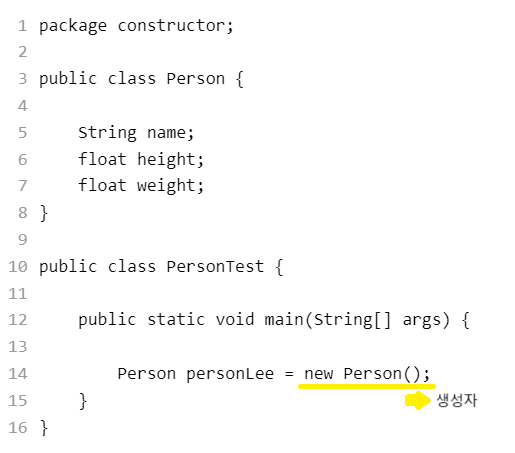 Person personKim = new Person(); personKim.name = "김씨"; personKim.weight = 85.5F; personKim.height = 180.0F;Person personLee = new Person("김씨", 175, 75);위 코드를 아래로 간략화하면 훨씬 보기 좋다.