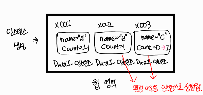 C count=3왜? 외부에서 생성된 인스턴스는 새로운 객체를 생성할 때마다 같은 인스턴스의 참조하기 때문이다.